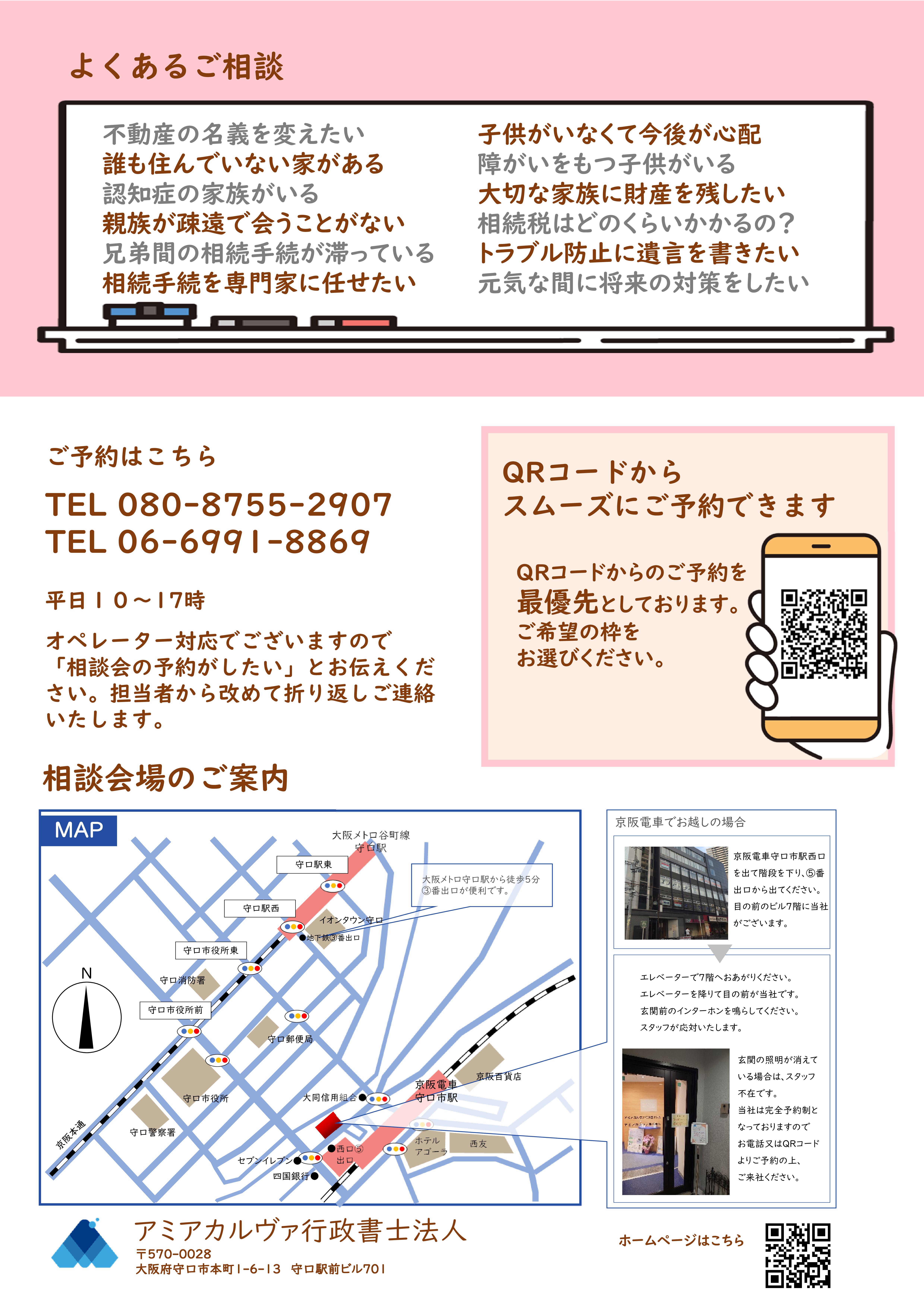 本文に「氏名」「住所」「相談内容」「お電話番号」「メールアドレス」「希望時間」をご記入の上、info@amiacalva.co.jp あてにメール送信のうえお申込み